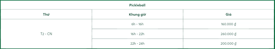 Giá thuê sân Pickleball The Mezzo được áp dụng linh hoạt tùy theo khung giờ chơi, dao động từ 160.000đ đến 260.000đ/giờ. Mức giá này phản ánh đúng chất lượng cơ sở vật chất hiện đại, mặt sân đạt chuẩn quốc tế và không gian luyện tập chuyên nghiệp mà The Mezzo mang lại. Đây là lựa chọn phù hợp cho cả những người mới bắt đầu làm quen với bộ môn Pickleball lẫn các nhóm bạn hoặc đội thi đấu muốn tìm kiếm địa điểm luyện tập chất lượng cao trong khu vực.